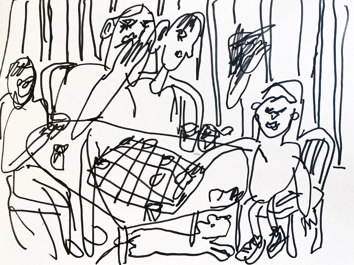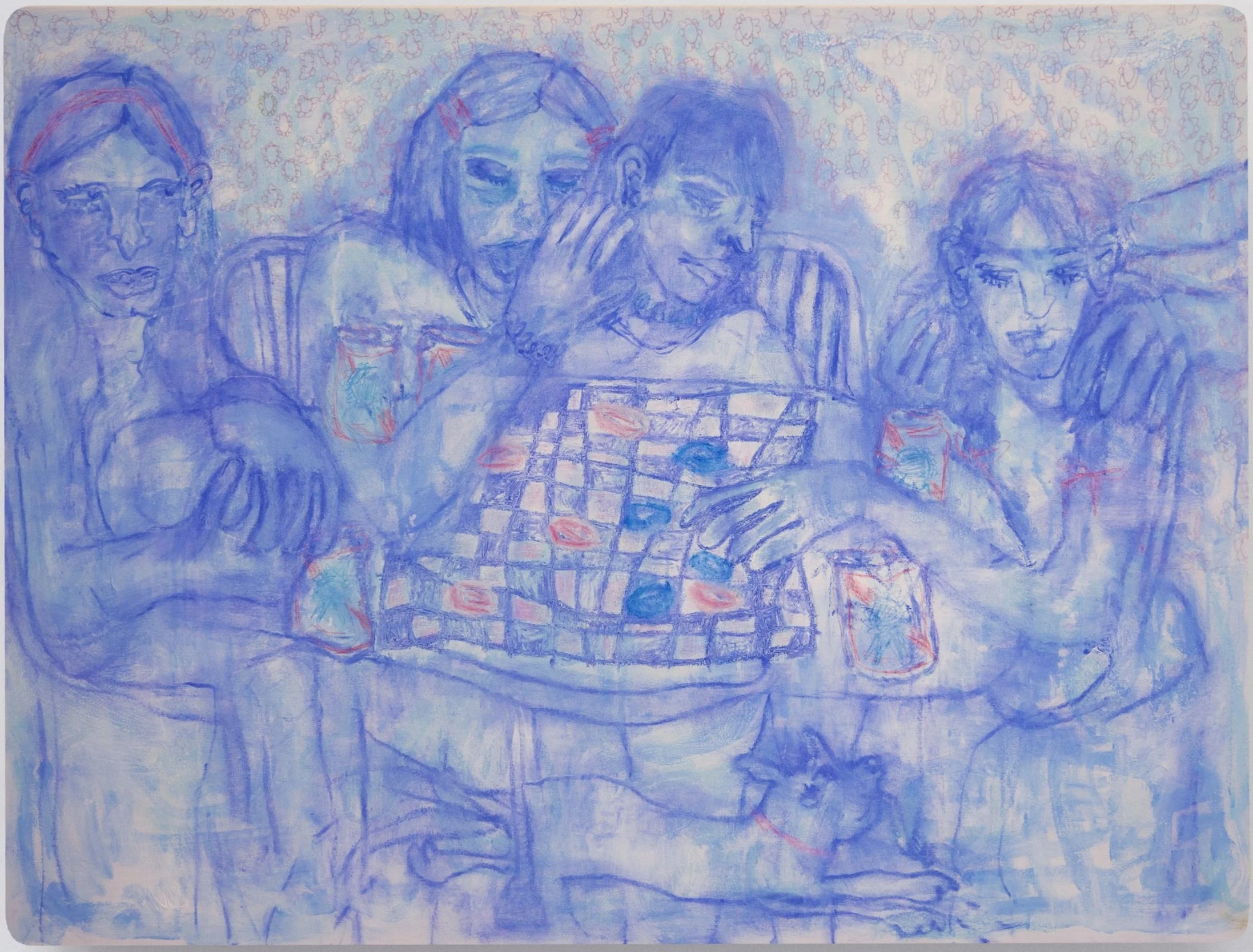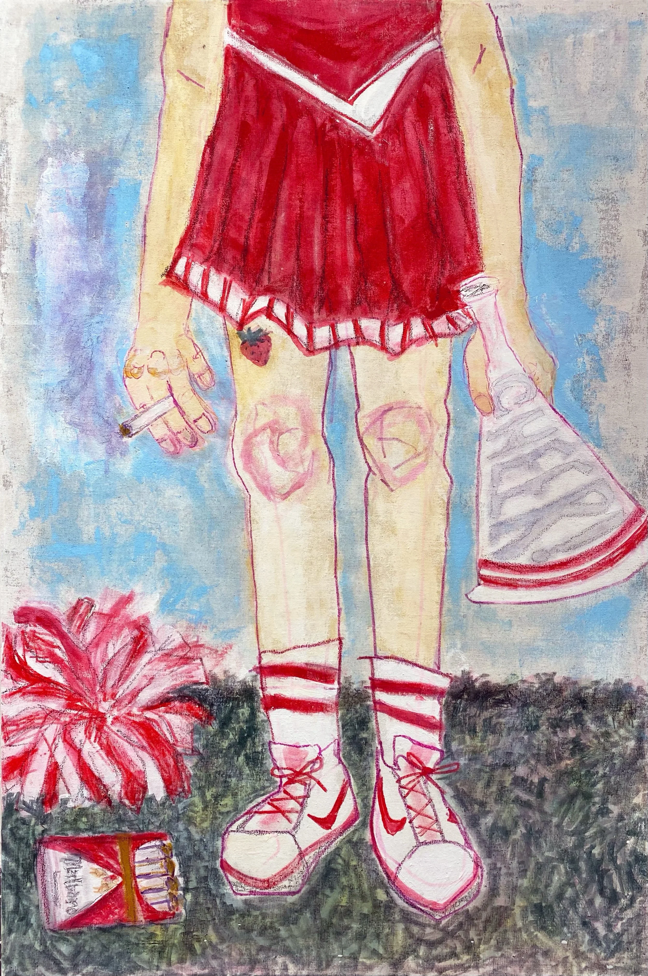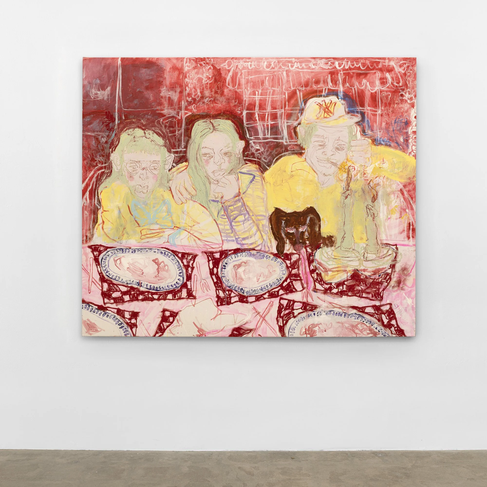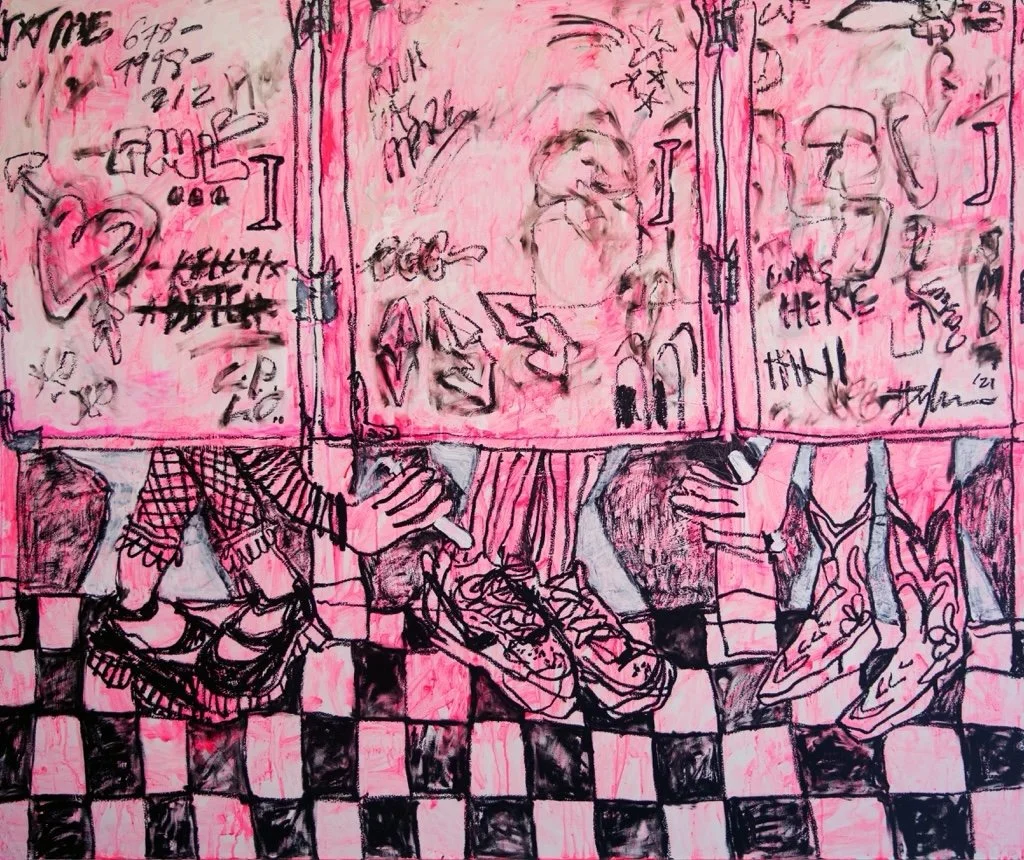 Veritable dreamscapes of the mind, Rheingold’s compositions are representational in their depictions of, for example, girls passing a tampon under the door of a bathroom stall (The Girls Rooms, 2021), attempting to buy beer when underage (Zip Code?, 2022), applying temporary tattoos under a fort made of blankets (Under the Fort, 2021). They are, however, also marked by a rich layering of varied media, and an inclination towards abstraction and surrealism. Acrylic, charcoal, china marker, colored pencil, and sometimes spray paint are applied by Rheingold in tandem, after creating a gestural sketch of the composition with oil sticks on canvas. The resulting union of varied techniques—exemplified by Take A Hint (2021) wherein the background is suffused in a wash of red oil paint, the faces of three figures at a dinner table are roughly articulated in china marker, and their clothes are ornamented with spray paint—challenges the conventional formality of her medium and produces a rather mystical haze that suggests the vagaries of memory.