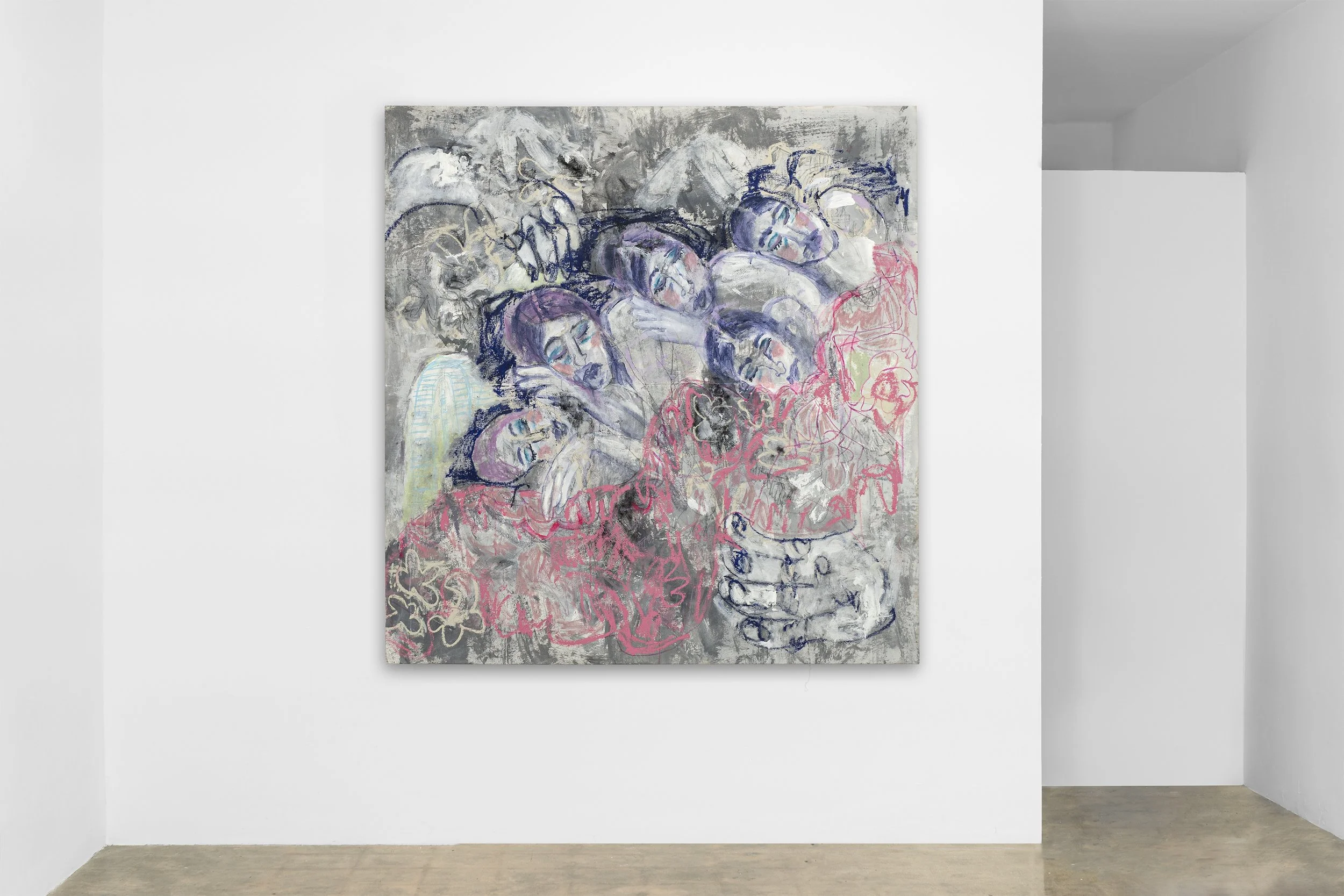 Dylan Rose Rheingold, Asleep On The Couch Again, 2021, Acrylic, oil, pastel, china marker, charcoal, marker on canvas, 78 by 72 in. 198.12 by 182.88 cm.